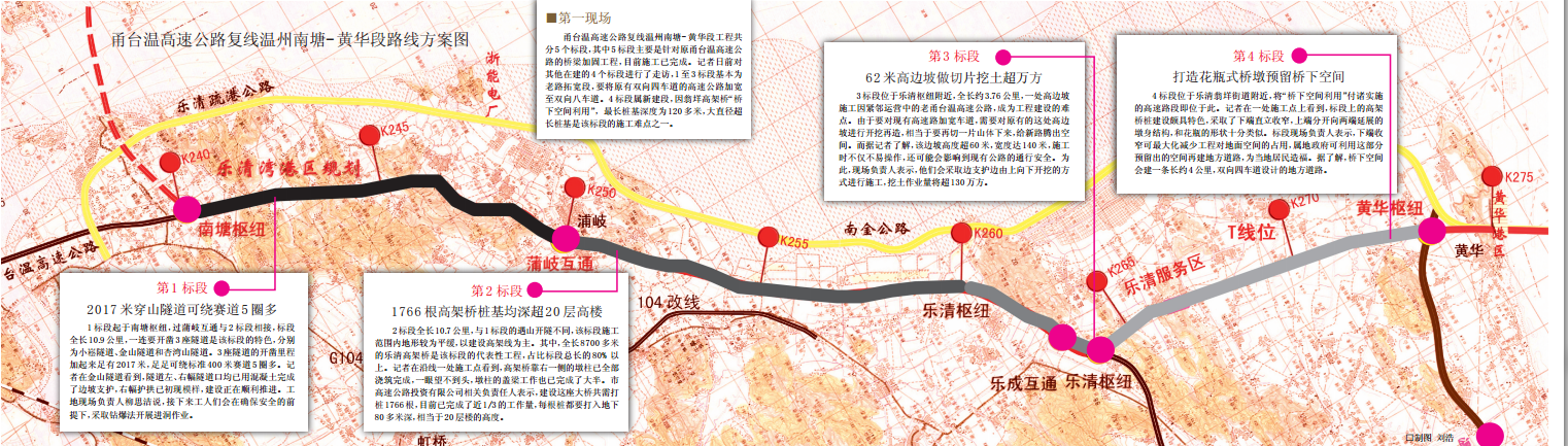 今年1月1日,令全市人民特别是乐清人民翘首以盼的甬台温高速公路复线温州南塘-黄华段工程,正式开工建设。该工程系我市打造136公里沿海纵向高速公路的起首段,也是我市“赶超发展三年超万亿投资”系列工程之一,预计会在2018年建成且具备通车条件,将极大方便市区、乐清两地居民出行。届时乐清翁垟街道到龙湾国际机场用时将缩短至10分钟,约23.65公里老路拓宽通车后,将率先成为我市唯一一段具备双向八车道通行能力的高速公路。