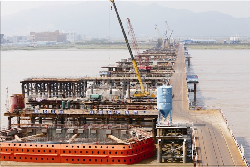 飞云江跨海特大桥水上钻孔灌注桩共582根,均为摩擦桩,最长桩基要打到水下