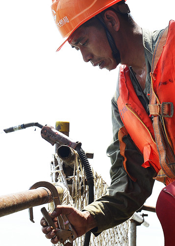 早上10点,下班时间到了。经过4个小时的连续作业后,陈国定与工友们沿着简易的小梯子,从3米深的隔舱里爬出来,深深吸了一口新鲜空气、狠狠擦了一把汗,“隔舱里实在是太闷热了。”陈国定说,“每个隔舱里分派两名焊接工一同作业,好有个照应,带班班组长半个小时就来巡查一次,看看大家伙的状态,并分发些冷饮以及解暑药。”