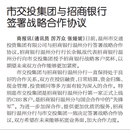 招行温州分行携手市交投集团签署战略合作协议加大合作力度