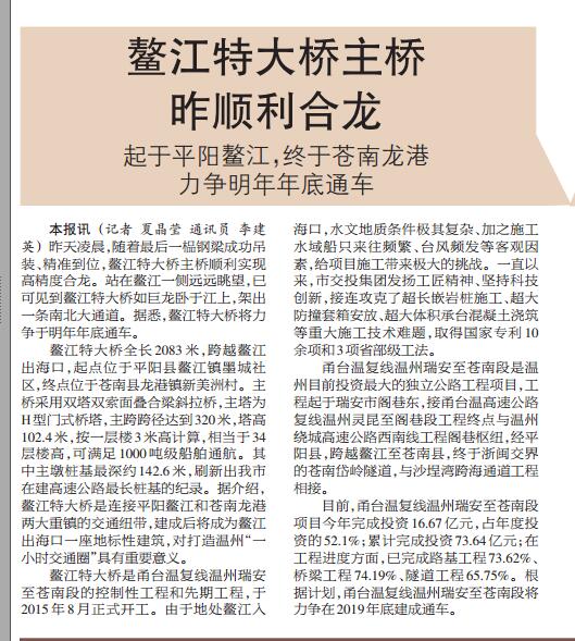 鳌江特大桥昨晨顺利合龙