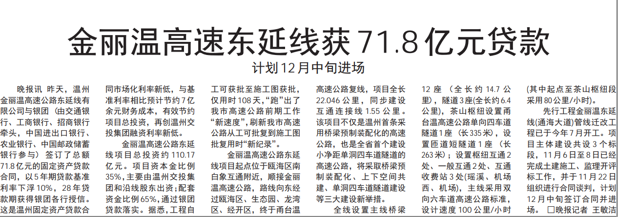 金丽温高速东延线获71.8亿元贷款
