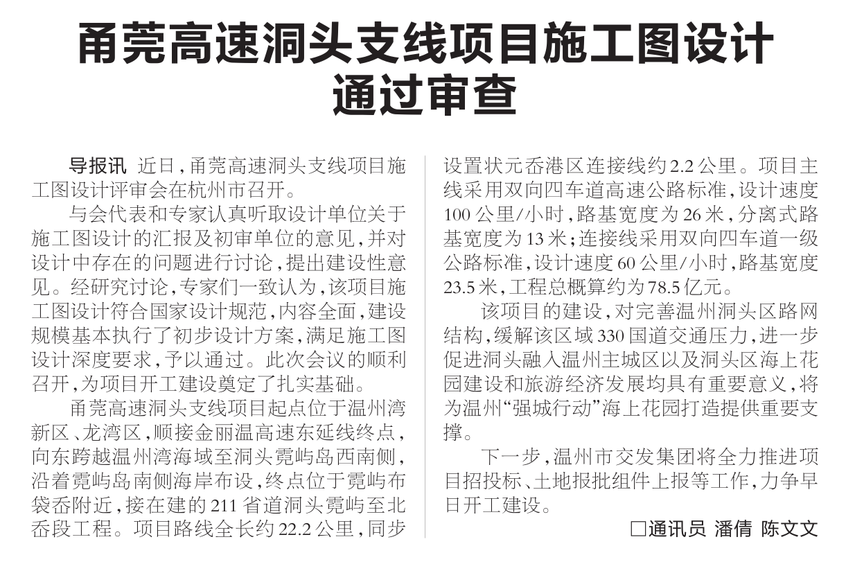 甬莞高速洞头支线项目施工图设计通过审查