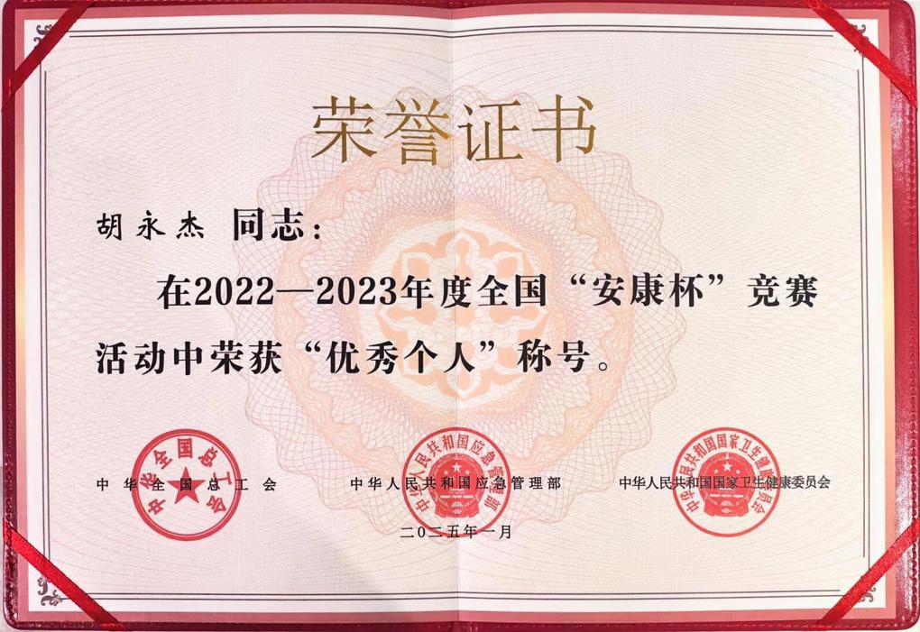 以责任担当筑牢安全防线| 公路工程公司胡永杰荣获安康杯“优秀个人”称号