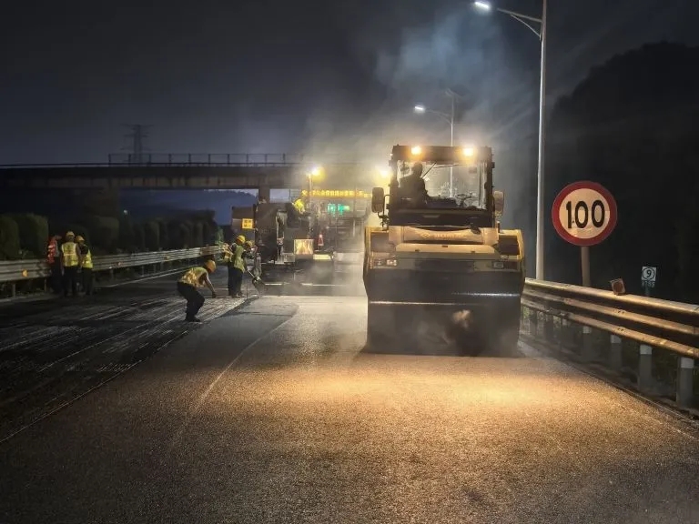 公司项目团队充分利用夜间气温稳定、交通流量较低等有利条件,紧抓夜间施工“黄金期”。通过采取车道交错施工、强化封道管控、人员预警分流及设备鸣报警示等一系列措施,有效保障了作业顺利推进。