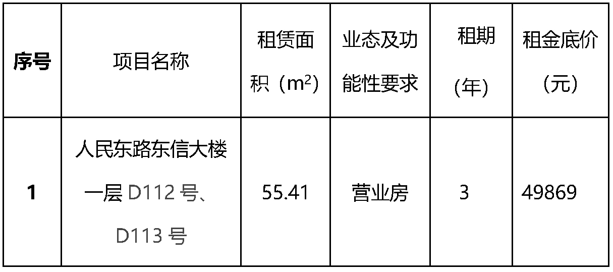 根据市国资委《关于加强市属国有企业房产土地租赁管理的若干指导意见》规定,温州市集团有限公司下属温州房地产开发股份有限公司就所属鹿城区人民东路东信大楼一层D112号、D113号资产经公司会议研究决定,以公开招租方式进行租赁,欢迎合格的意向承租人来竞标。