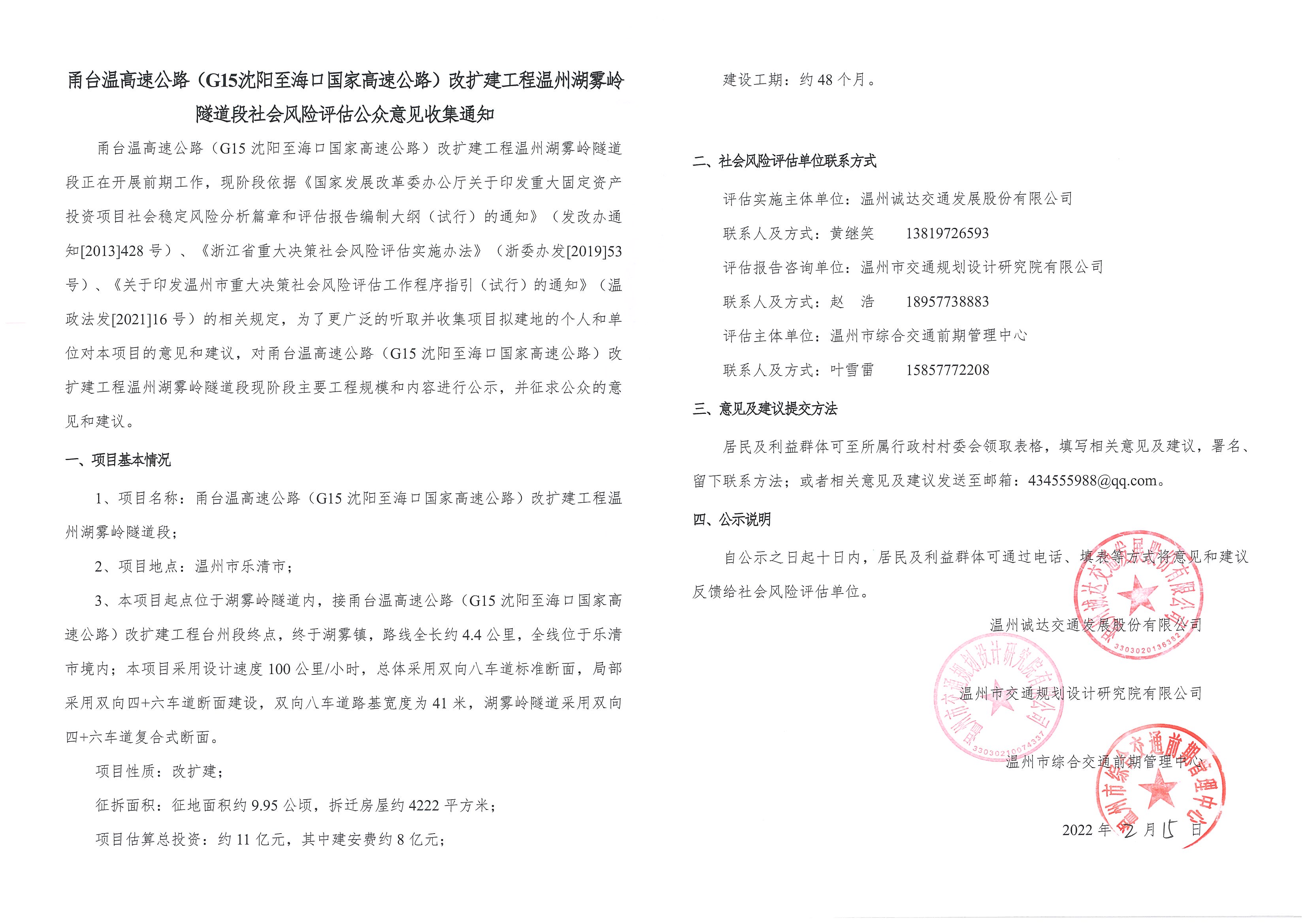 甬台温高速公路改扩建工程 (温州湖雾镇至南塘枢纽、乐清枢纽至北白象段) 社会风险评估公众意见收集通知