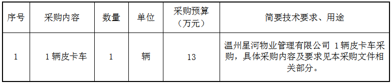 根据《温州市市属国有企业采购管理办法(试行)》等有关规定,浙江省成套招标代理有限公司受温州星河物业管理有限公司的委托,就其 1辆皮卡车采购项目进行公开招标,欢迎合格的投标人前来投标。