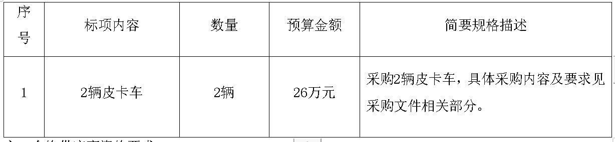 根据《温州市市属国有企业采购管理办法(试行)》等有关规定,科信联合工程咨询有限公司受温州市交通工程试验检测有限公司委托,就2辆皮卡车以公开招标方式进行国企采购,欢迎国内合格的供应商前来投标。