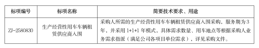 二、项目名称:生产经营性用车车辆租赁供应商入围