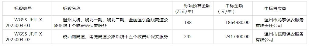 温州市365在线体育投注官网集团所属温州市高速公路运营管理有限公司关于2025-2027年高速公路收费站点保安服务(标段一、标段二)项目的采购结果公示