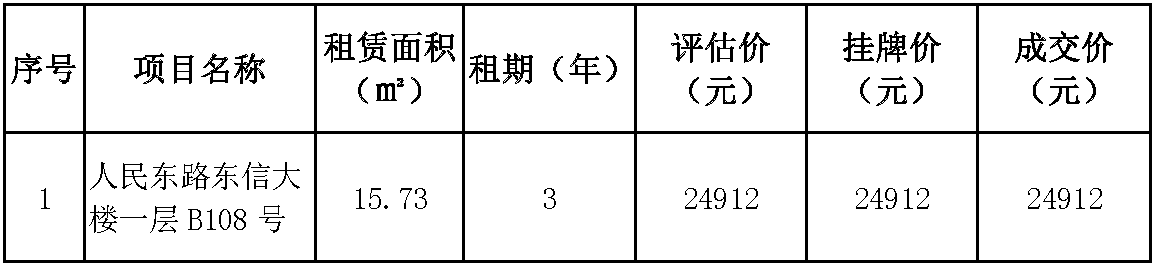 温州市集团有限公司下属温州房地产开发股份有限公司就所属鹿城区人民东路东信大楼一层B108号资产项目于2022年6月30日发布招租公告,现将招租结果公示如下: