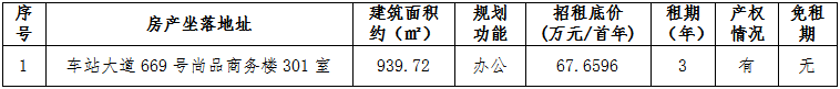 现委托温州联合产权交易中心有限公司,定于2023年6月5日15时整,在温州开诚拍卖有限公司拍卖厅,对温州市鹿城区车站大道669号尚品商务楼301室办公用房三年租赁权进行增价式拍卖,具体拍卖事宜详见《竞买协议》及《房产租赁合同》(样本)。