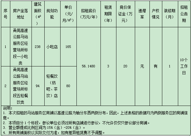 温州市365在线体育投注官网集团经营公司关于甬莞高速公路马站服务区经营场所标段一小吃类、标段五轻餐饮类2处商铺(合并)三年租赁权交易公告