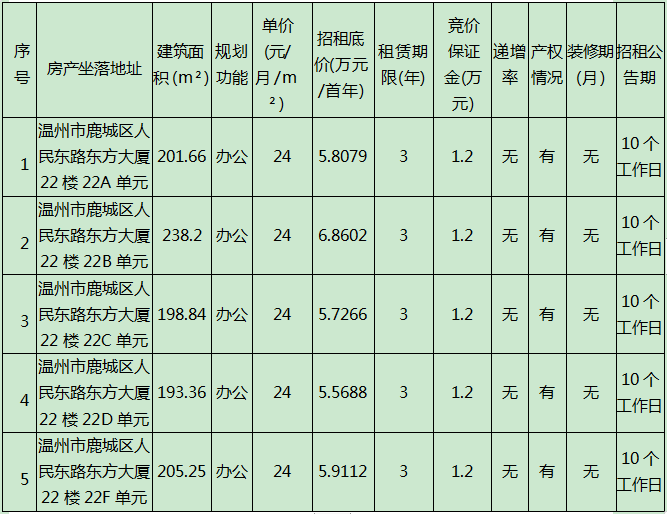 市365在线体育投注官网集团经营公司关于温州市鹿城区人民东路东方大厦22楼22A单元、22B单元、22C单元、22D单元、22F单元5宗办公房三年租赁权交易公告