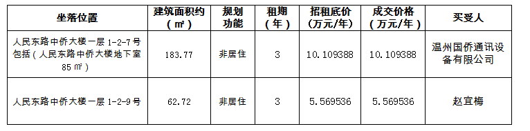 温州房地产开发股份有限公司就温州市鹿城区人民东路中侨大楼一层1-2-7号包括(人民东路中侨大楼地下室85㎡)、人民东路中侨大楼一层1-2-9号2宗非居住用房三年租赁权于2024年9月9日至9月24日进行公开招租,经评估机构评估、委托产权交易中心拍卖及公开竞价并按相关程序审批,已完成公开拍卖,现将拍卖结果公示如下: