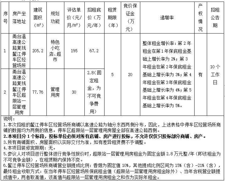 温州市365在线体育投注官网集团经营公司关于甬台温高速公路复线鳌江停车区经营场所、鳌江停车区超限站一层管理用房2处房产五年租赁权交易公告