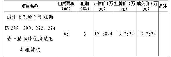市365在线体育投注官网集团经营公司关于温州市鹿城区学院西路288、290、292、294号一层非居住房屋五年租赁权资产于2024年12月25日发布招租公告,现将招租结果公示如下: