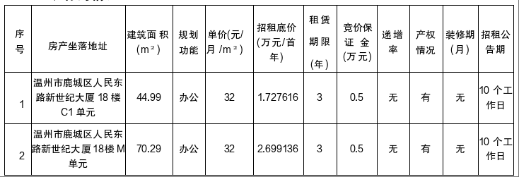 现委托温州联合产权交易中心有限公司,信息披露期自2025年2月28日起至2025年3月13日下午5时整止,于2025年3月17日10时至2025年3月17日11时止(延时除外)通过“浙交汇”平台对以下标的租赁权进行“网络竞价”式交易,具体事宜详见“浙交汇”网站项目信息披露。