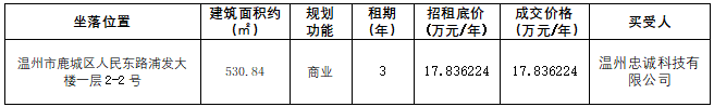 温州房地产开发股份有限公司就温州市鹿城区人民东路浦发大楼一层2-2号非居住用房三年租赁权(第二次)于2025年11月3日至11月7日进行公开招租,经评估机构评估、委托产权交易中心竞价及公开竞价并按相关程序审批,已完成公开竞价,现将竞价结果公示如下: