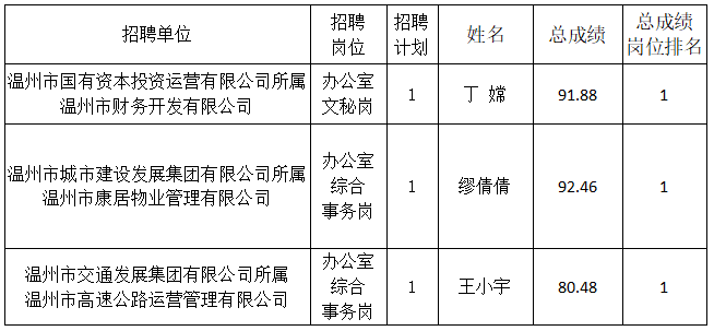 根据《温州市市属国有企业面向退役女兵招聘工作人员的公告》的规定及应聘者体能测试、面试总成绩,确定以下人员入围体检与考核环节。体检工作拟定于近期进行,请入围应聘者保持通讯畅通,体检的具体时间、地点和要求另行通知。现将有关事项预备通知如下: