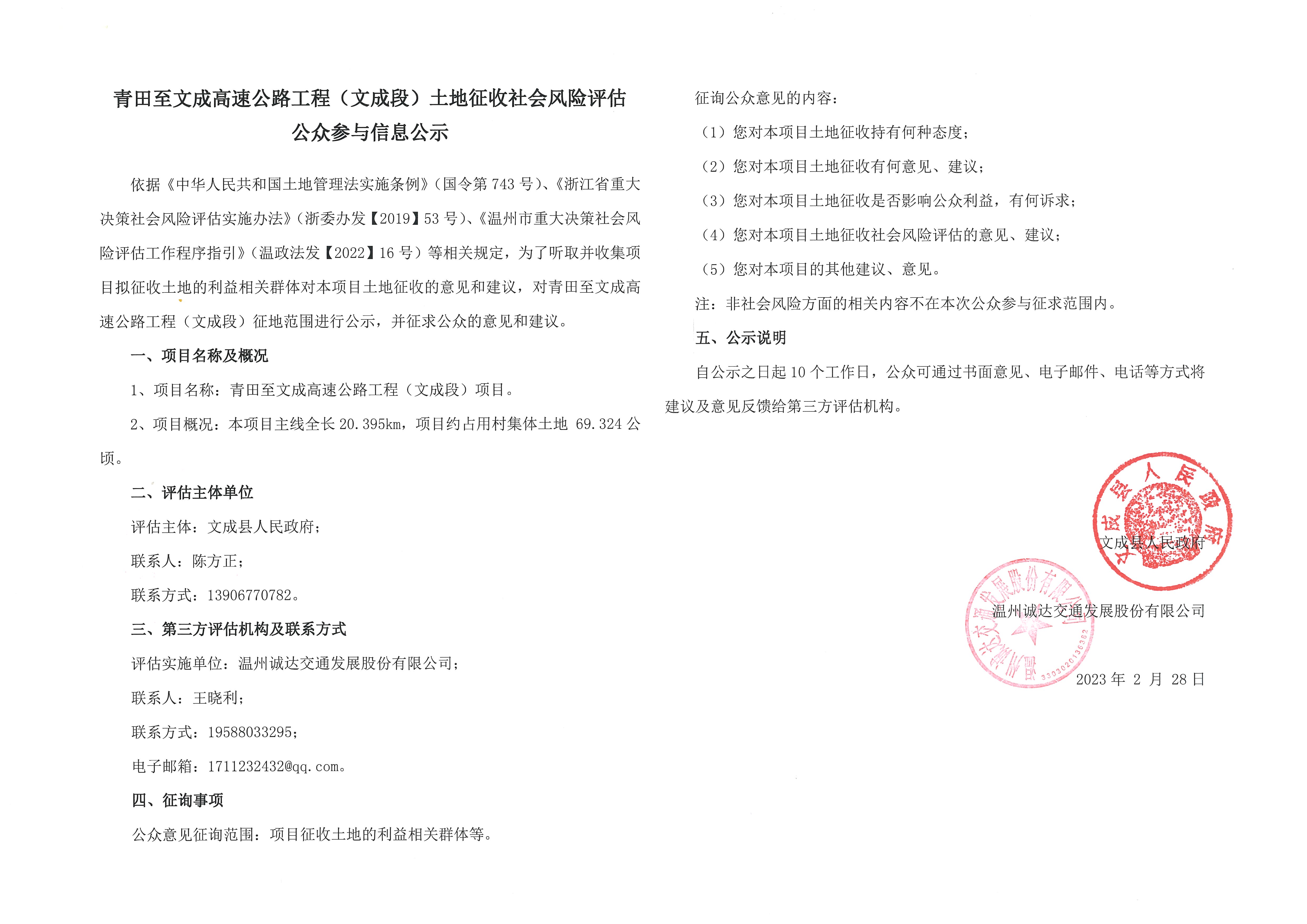 青田至文成高速公路工程(文成段)土地征收社会风险评估公众参与信息公示