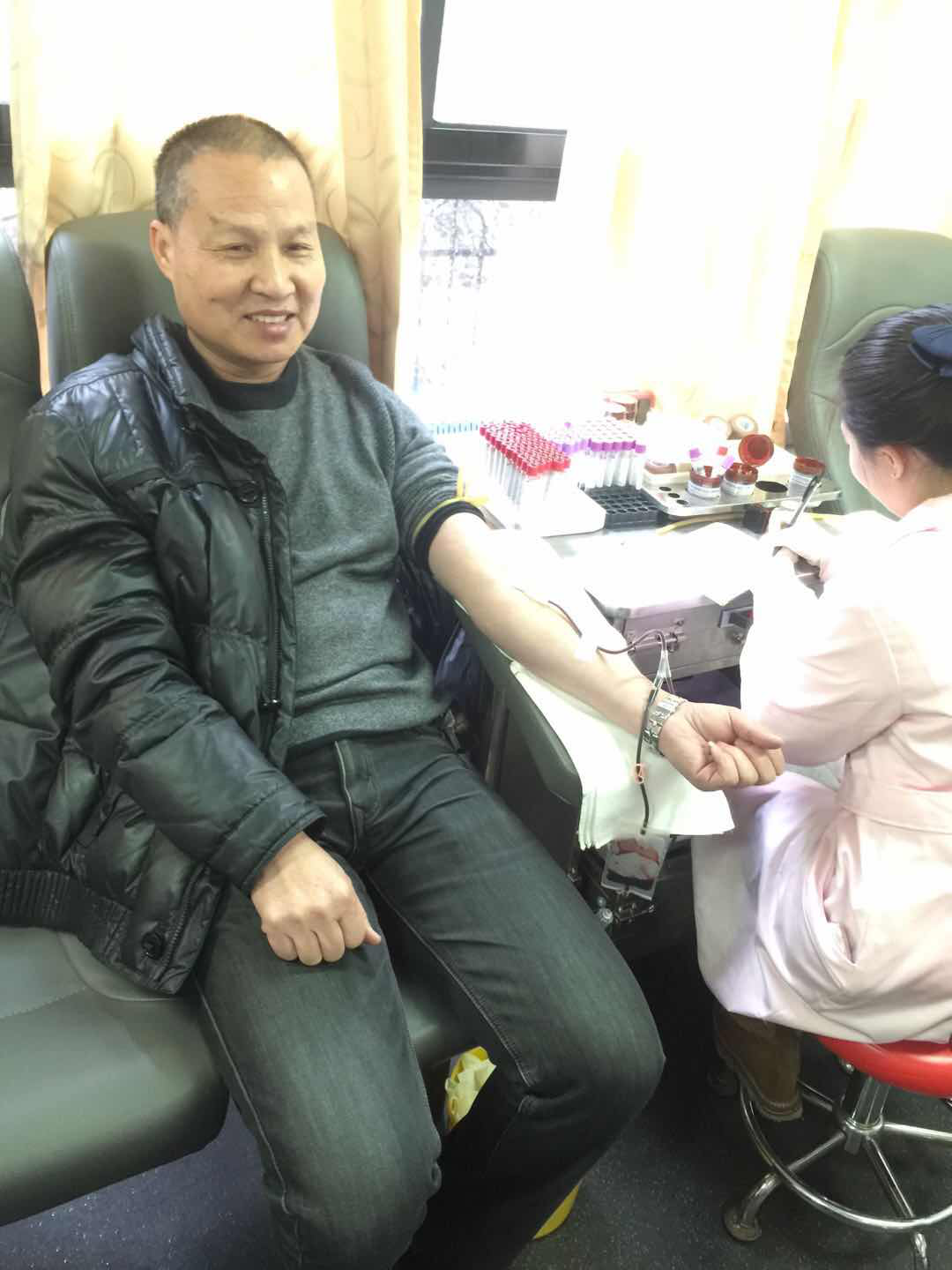 老书记持续十年来一直坚持献血,个人累积献血量已达4500ml。在与同事攀谈中,他表示,“因一次工作的经历,与献血结缘,并持续了十多个年头,自己坚持献血,是因为献血能够造福社会,帮助人民,更有利于健康,这不仅是自己闪光的人生经历,更是身为一名深蒙党恩的老党员薪火相传的爱心接力。”以后有机会还会持续献血,奉献爱心。在献血过程中,林书记亲切的和工作人员拉起家常,叮嘱他们:工作辛苦,一定要注意身体!