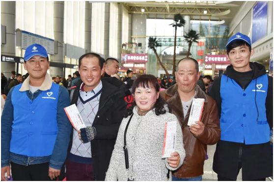 志愿者穿着统一的蓝色小背心和志愿小蓝帽,开着一辆爱心送站车准时来到宿舍楼前接送,虽然天气寒冷,每位志愿者却都是热心满满,全程贴心护送工人们通过检票口,帮忙搬运行李,寻找检票口,将他们送上了开往家乡的车。