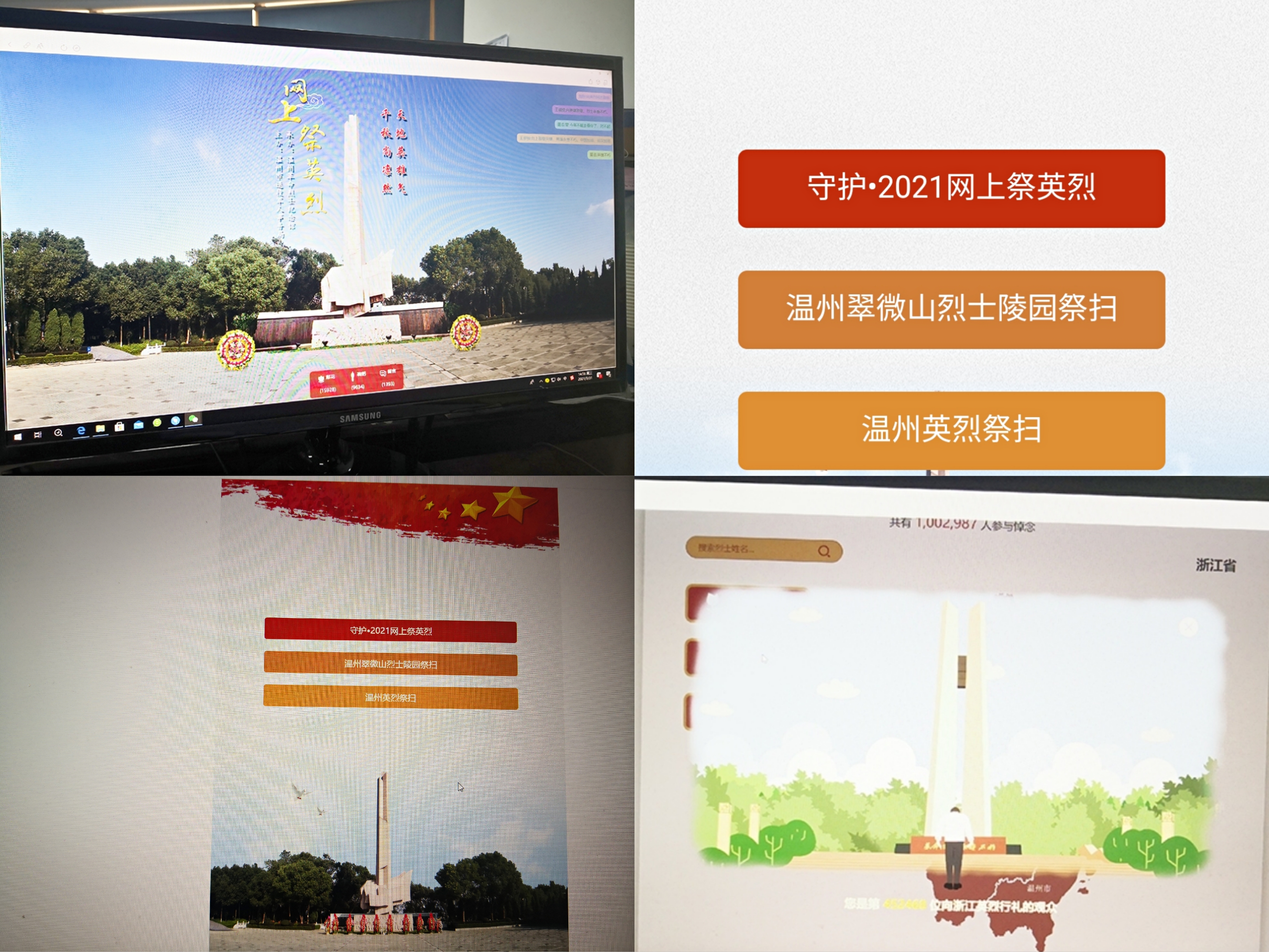 4月1日下午,一场“线上线下祭英烈”活动如期开展。在巍峨耸立的革命烈士纪念碑前、在温州烈士英烈墙前,党员代表敬献花圈、挽联、鲜花,行默哀礼,以表达对先烈士们的无限缅怀。其余党员通过在网上给革命先烈献花、鞠躬、留言寄语等方式表达对先烈的哀思和崇高敬礼。