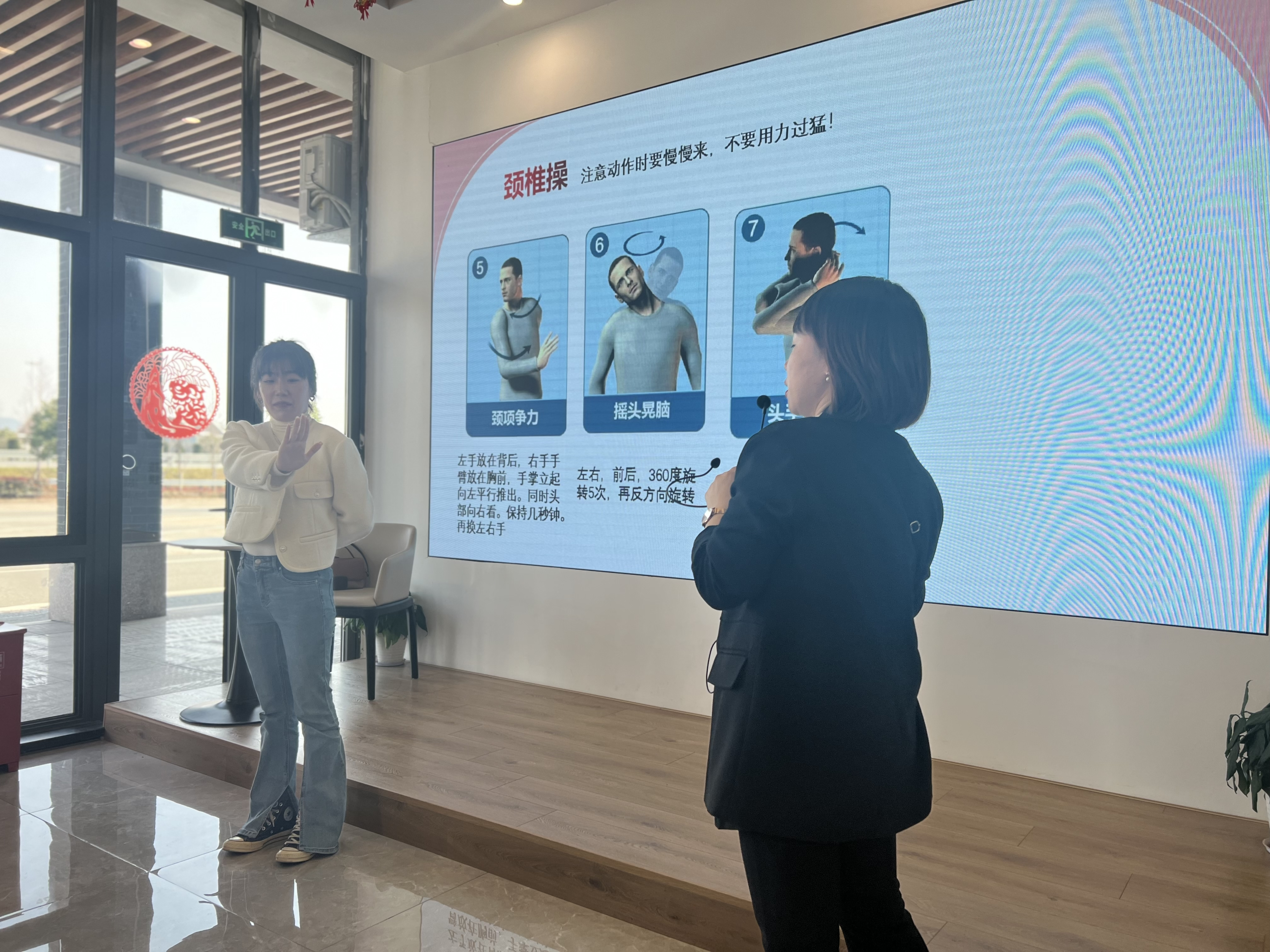 黄老师结合自身工作经历,生动详实、声情并茂的为大家讲解了如何保养身体,预防办公室常见病,又为现场员工播放颈椎操学习视频,鼓励大家日常要多做运动,减少因久坐产生的职业病。