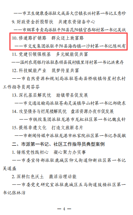 近日,市365在线体育投注官网集团党委所属运营公司党总支派驻平阳县海西镇一沙村第一书记陈双有《修道路扩销路 群众迈上致富路》驻村帮扶事迹入选市派第一书记、农村工作指导员典型案例。身为“交通人”的陈双有,把修缮道路作为帮扶的切入口,争取资金220余万元修建村内道路5条约4.5公里,统筹多方资源拓展农渔产品销售渠道,助力村民和村集体增收致富,落地10余项民生实事、开展20余场惠民活动、推进1个共富项目,用实际行动践行了第一书记的使命担当。