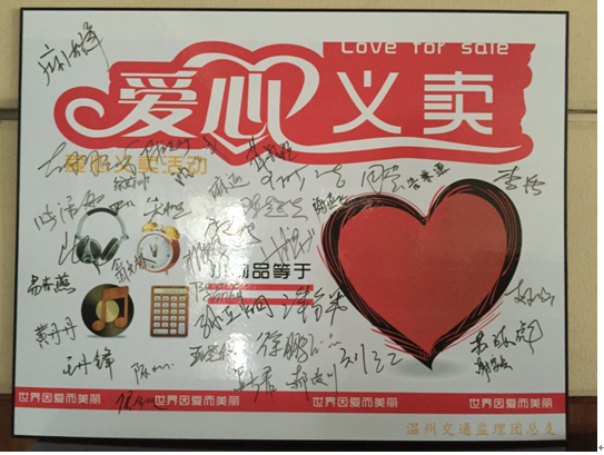 交通监理团总支于去年开展了第一届爱心义卖活动,得到了大家的一致好评,本届活动是对上届的继承和发扬,目的是将公司干部职工的爱心一直能够传递下去。