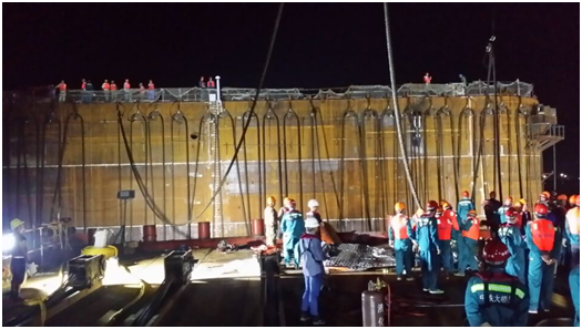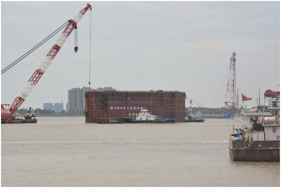 温州瓯江北口大桥中塔钢沉井底节于22日晚8时45分浮运至瓯江北口大桥桥址墩位处,23日上午钢沉井主缆与上、下游锚墩平台顺利完成缆绳挂设。